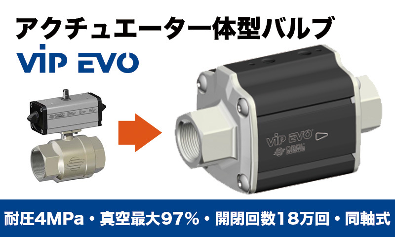 エアー駆動式のアクチュエータを内蔵した同軸バルブ「VIP エボ」シリーズは、高耐圧と長寿命を実現した画期的なバルブです。最高4MPa(kgf/cm2)の高耐圧と、開閉回数18万回の長寿命で省スペース化と省コストに貢献。今までアクチュエータ+ボールバルブしか設置できなかった使用環境でも、VIPエボなら対応可能です。