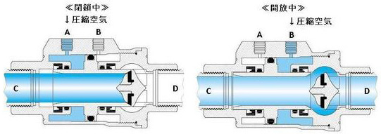 高耐久性、高速動作からブロー成形機の吹きこみバルブ、噴水の制御バルブ、充填装置の制御バルブとして実績があります。ダブルアクションはエアーで開閉、スプリングリターン式は開閉動作のどちらかをエアーで、もう一方をスプリングで行います。