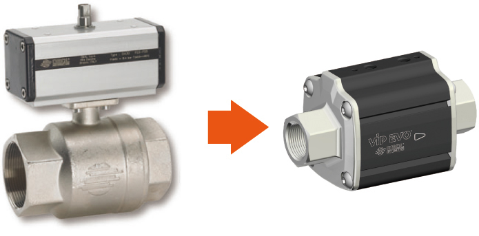 エアー駆動式のアクチュエータを内蔵した同軸バルブ「VIP エボ」シリーズは、高耐圧と長寿命を実現した画期的なバルブです。最高4MPa(kgf/cm2)の高耐圧と、開閉回数18万回の長寿命で省スペース化と省コストに貢献。今までアクチュエータ+ボールバルブしか設置できなかった使用環境でも、VIPエボなら対応可能です。